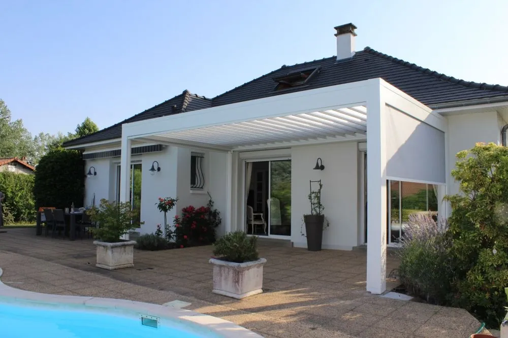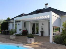 Pergola bioclimatique, lames orientables, manœuvre électrique, laquage armature et lames : BLANC Ral 9010 Stores incorporés, manœuvre électrique avec télécommande. Eclairage leds sur les 2 avancées et sur 1 longueur Réalisation COUZEIX 87270 -