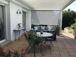 PERGO'KLIM ACCESS 250 orientables • Laquage armature: Gris anthracite RAL 7016 fine texture et lames blanche • Store ZIP sur l'avancée - Toile SCREEN 550 beige 2020 • Manœuvre électrique 230 V SOMFY IO avec émetteur SITUO IO Pure • Rubans leds sur les 4 cotés -