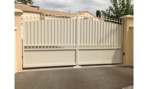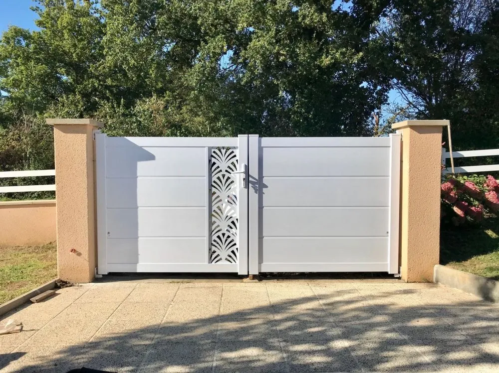 Portail aluminium, 2 vantaux de couleur blanc azuré. Zone déco : tôle découpe laser ORIENT -