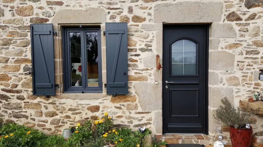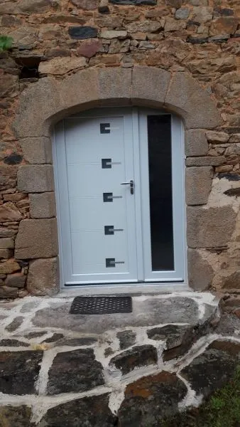 Porte fenêtre PVC blanc, petits-bois incorporés blancs Porte d'entrée plaxé gris anthracite, vitrage sécurité, petits bois incorporés alu plomb, soubassement plein post formé, poignée SECUTIK Inox SAINT MARHIEU 87440 -