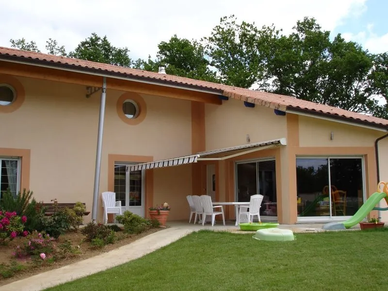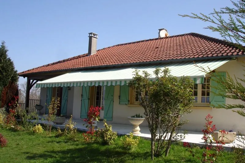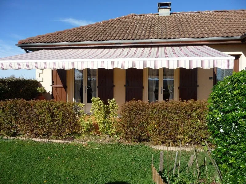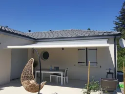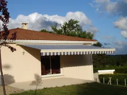 Store banne cassette aux lignes raffinées qui se distingue par son lambrequin enroulable intégré et protégé dans la barre de charge et par son éclairage à LED intégré aux bras. Réalisation 87 270 COUZEIX -