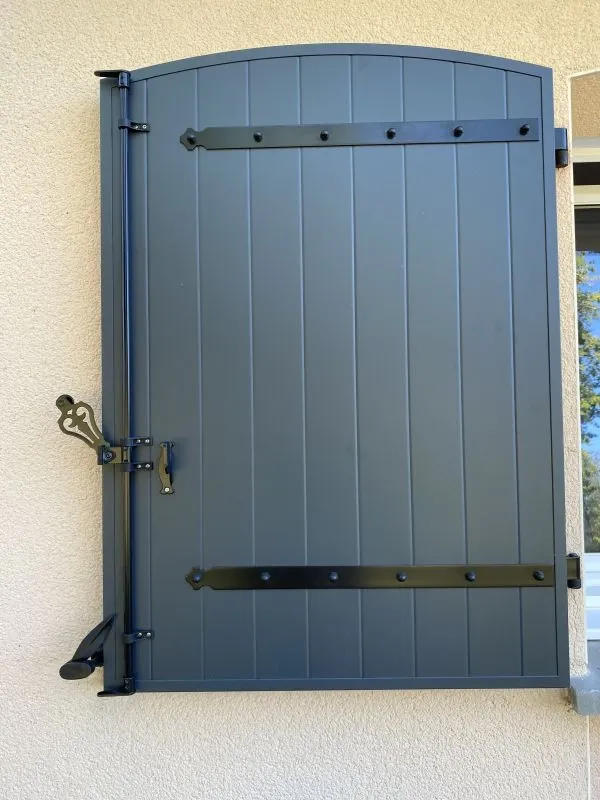 Volet battant ALU plein Larg 800 mm x Haut 1130 mm . 1 vantail . Ouverture à droite (vue intérieure) . Avec pentures et contre pentures Alu . Sans gond (gonds existant) . Panneaux ISOLES 27 mm . Coloris : gamme TOUT RAL « Satiné » 7016 . Pentures posées bout feston alu noir . Espagnolette alu romantique noir posée . Arrêts marseillais tirefonds . Cintre surbaissé REGULIER (flèche de 0 à 300mm) -
